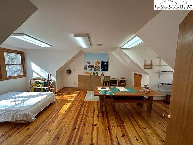 This bright attic bedroom features sloped ceilings that add character to the space. Natural light floods the room through windows, highlighting the warm, polished pine flooring. A simple white bed occupies one corner, adjacent to a wooden shelving unit, suggesting a cozy, casual vibe. A sturdy table with assorted materials sits centrally, perfect for creative projects. The color palette includes soft whites and earthy wood tones, enhancing the inviting atmosphere. Decorative artwork on the walls adds personal touches, while a small area rug contributes comfort underfoot. This multifunctional space balances relaxation and creativity.