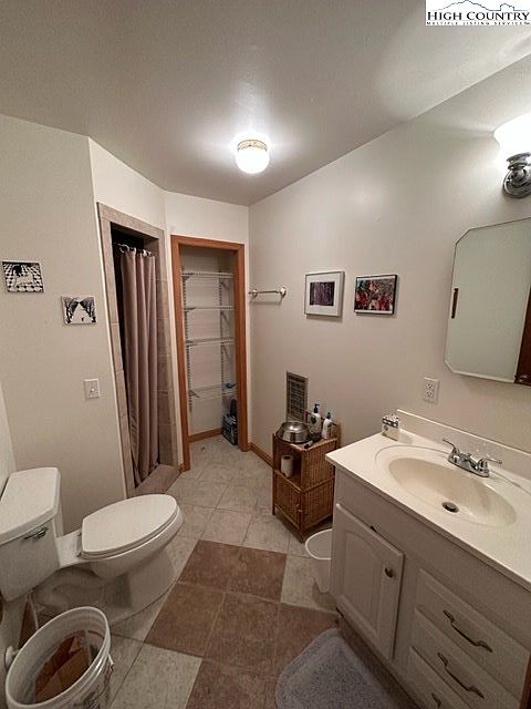 A small bathroom featuring a simple yet functional layout. The walls are painted white, enhancing the room’s brightness. A compact vanity with a sink occupies the right side, complemented by a mirror above. Light fixtures provide soft illumination, while beige tiles on the floor add warmth. To the left, a shower area is partially enclosed by a taupe curtain. A door leads to a storage closet, showcasing shelves for essentials. Decorative elements include framed photographs on the walls, infusing personality and charm into the space. Overall, the bathroom balances practicality with a touch of coziness.