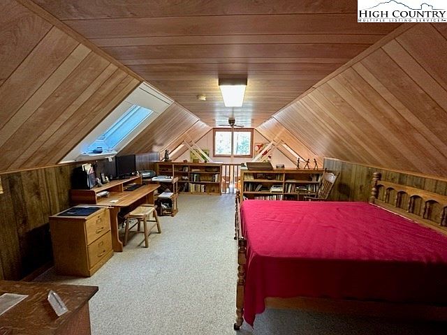 This attic space features sloping wooden ceilings and a cozy, bright atmosphere. Natural light streams through a skylight and window, illuminating warm wood paneling. A red bedspread adorns a vintage wooden bed, adding a pop of color. On one side, a simple desk and chair provide a workspace, accompanied by a computer and supplies, while bookshelves line the walls, filled with various books. The carpeted floor complements the rustic aesthetic. Overall, the combination of wood textures, functional furnishings, and thoughtful lighting creates an inviting and versatile retreat, ideal for relaxation or productivity.