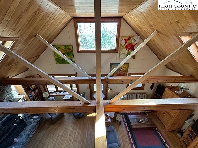 Aerial view of a spacious living room showcases a vaulted ceiling with exposed wooden beams contributing to a rustic aesthetic. Natural light pours in from large windows, illuminating the warm wood tones throughout the space. The walls are adorned with vibrant artwork, adding color against the light-toned paneling. A cozy seating arrangement of plush gray sofas encourages relaxation, complemented by a coffee table and open shelving filled with books. A stone fireplace anchors the room, enhancing the inviting atmosphere. The hardwood flooring adds warmth and connects the various elements, creating a harmonious blend of nature and comfort.