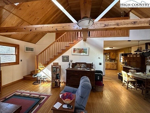 A spacious living room features wooden beams and high ceilings, enhancing the rustic charm. The warm tones of the wood flooring complement the inviting atmosphere. A comfortable blue armchair sits next to a small wooden table, while a multicolored area rug adds a cozy touch underfoot. Natural light streams in through large windows, illuminating the space. A wooden staircase with an elegant railing leads to a loft area, visible in the background. The room is decorated with framed artwork, adding a personal touch, while an antique wooden sideboard serves as a focal point, showcasing the home’s character.