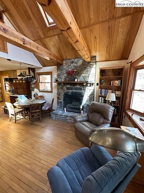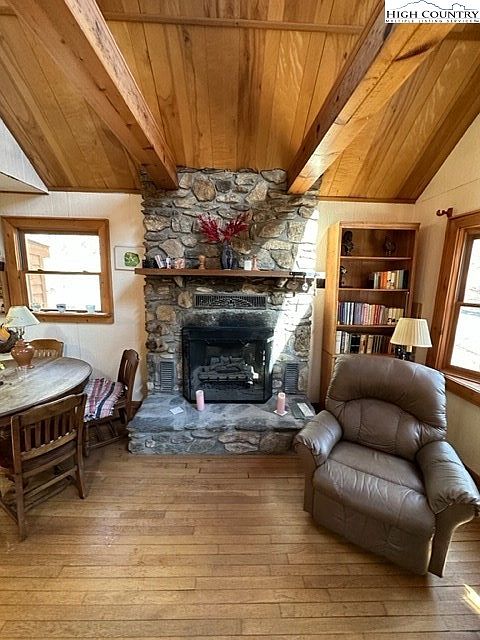 This cozy living room features a vaulted ceiling with exposed wooden beams, enhancing its rustic charm. A central stone fireplace serves as the focal point, flanked by a warm wooden mantel and decorative accents. The space includes a comfortable recliner and a wooden dining table with matching chairs, a perfect gathering spot. Natural light floods the room through large, framed windows, illuminating the rich wood flooring. Bookshelves line one wall, adding character and functionality. The inviting color palette includes earthy tones, creating a harmonious atmosphere ideal for relaxation and socializing.