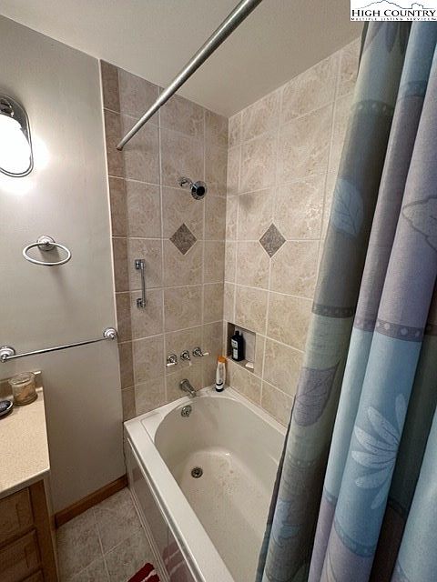 This bathroom features a cozy layout with a tub-shower combo enclosed by a clear shower curtain adorned with soft floral motifs. The walls are covered in light-colored, textured tiles, accented with dark diamond-shaped inserts that add visual interest. A wall-mounted light fixture illuminates the space, enhancing the warm ambiance. The countertop is a subtle beige, complemented by natural wood cabinetry, offering both functionality and warmth. A towel bar is positioned conveniently nearby, while essentials are neatly arranged on the counter. The overall aesthetic combines practicality with a soothing color palette, creating a welcoming retreat.