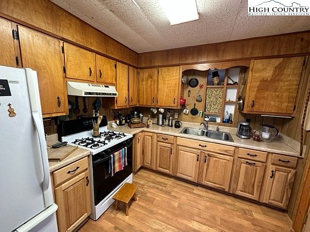 A cozy kitchen space featuring warm wooden cabinets and countertops that exude a rustic charm. The cabinetry is a rich honey tone, providing a classic, timeless feel. A white gas stove and matching refrigerator complement the warm wood tones, while colorful kitchen towels hang from the stove for a touch of personality. The double sink is positioned under a large window, enhancing natural light. Open shelving displays kitchenware and adds an inviting atmosphere. Light brown flooring adds continuity to the design, enhancing warmth and comfort, making this kitchen both functional and aesthetically pleasing.