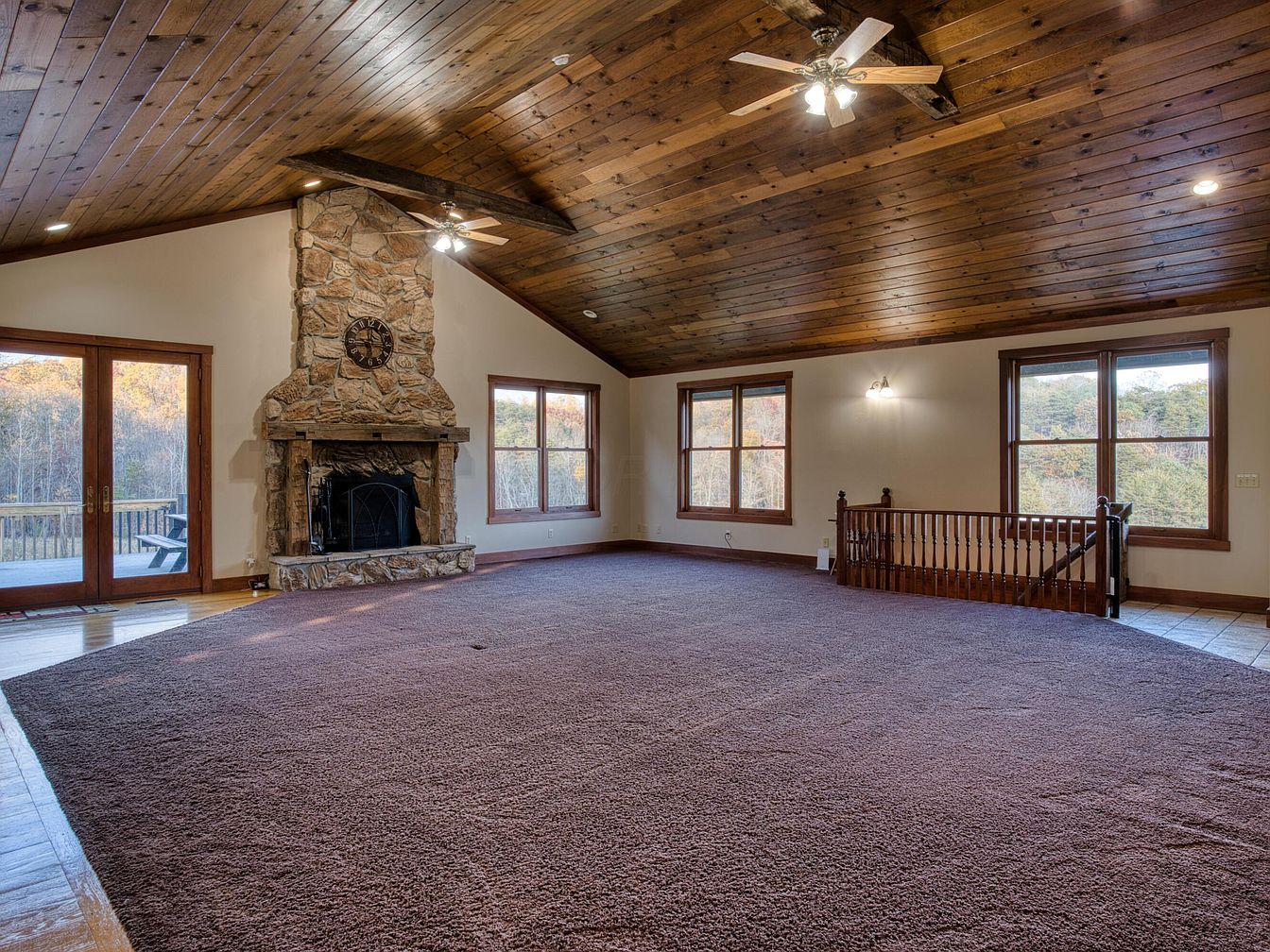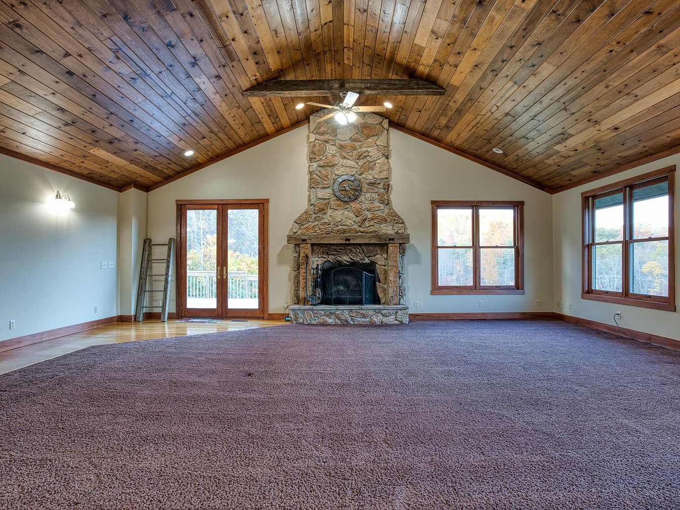This spacious living room features a dramatic, vaulted ceiling lined with rich wood planks and highlighted by an exposed beam above a rustic stone fireplace. The stone fireplace is the focal point, complete with a carved relic hanging above the mantel and a metal firescreen. Two large windows on the right and glass double doors to the left let in ample natural light, framing views of trees outdoors. The floor is largely covered with plush, muted mauve carpet, while the area near the doors showcases polished wood. Walls are painted a soft neutral, enhancing the warm, inviting atmosphere.