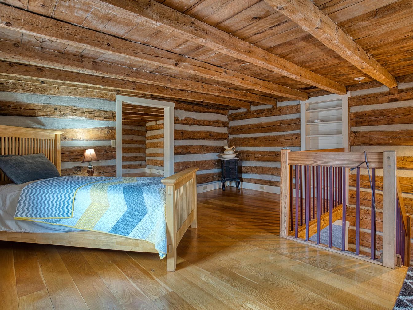 A cozy upstairs bedroom features rustic log walls and exposed wooden ceiling beams, emphasizing historic craftsmanship. Honey-toned hardwood floors add warmth and unity to the space. A light wooden slat bed takes center stage, adorned with a blue, yellow, and white chevron quilt and simple pillows. To the left, a small bedside lamp casts soft light, enhancing the room’s inviting atmosphere. An open stair railing of matching wood with vertical spindles guards the edge, suggesting this is a loft area. Built-in shelves, a small dark side table, and white trim around the doorway balance comfort with vintage charm.