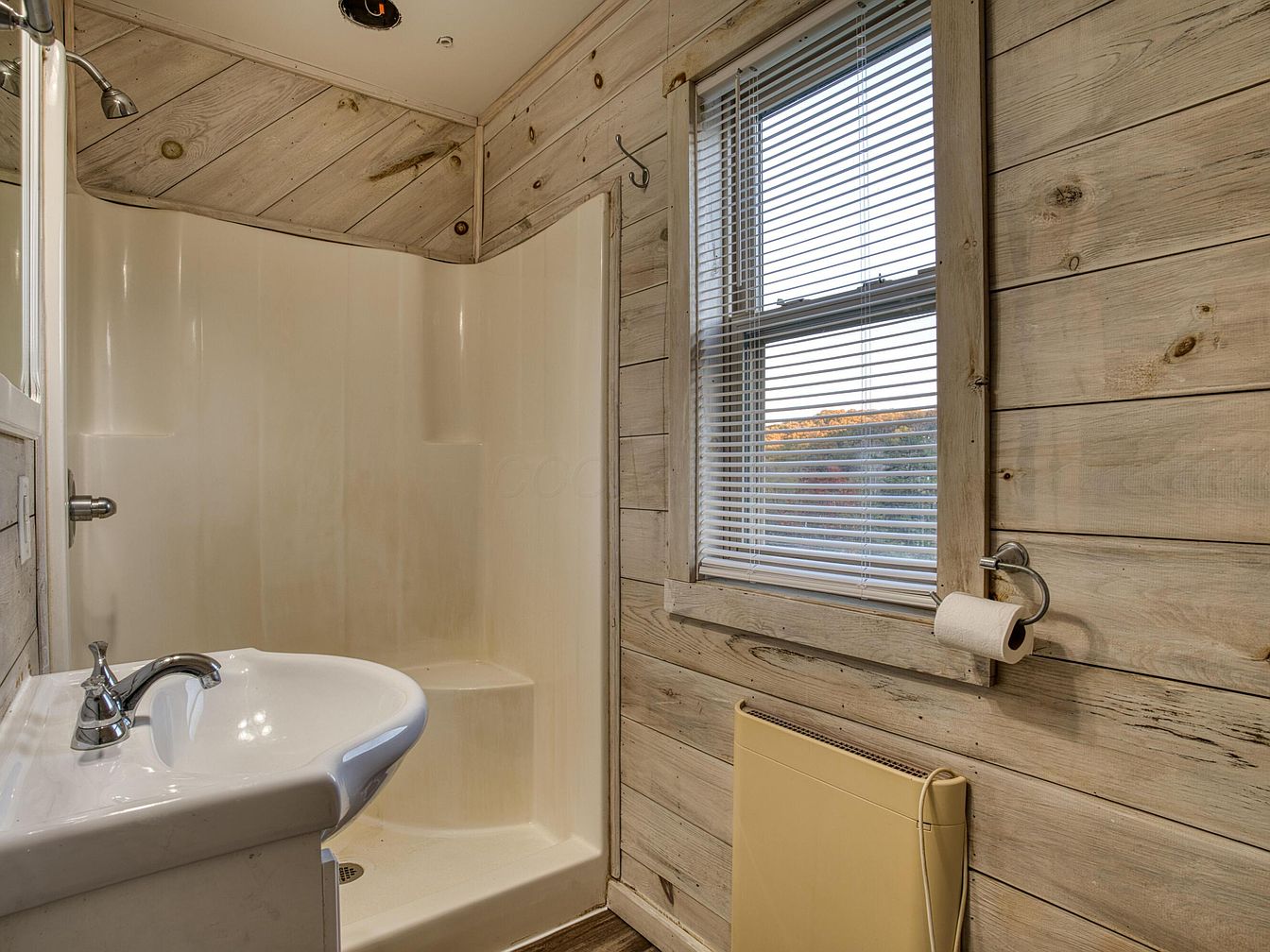 A cozy bathroom featuring rustic, weathered wood paneling covering the walls and ceiling, providing a cabin-like charm. There is a white, molded corner shower unit with built-in shelving and a chrome showerhead mounted on the left. A simple white sink with a chrome faucet sits beside the shower, complemented by a plain mirror above. A medium-sized window with white blinds brings in natural light and looks out on greenery, while a chrome toilet paper holder is mounted conveniently beside the window. Below, a beige wall heater adds function and blends into the neutral, earthy color palette.