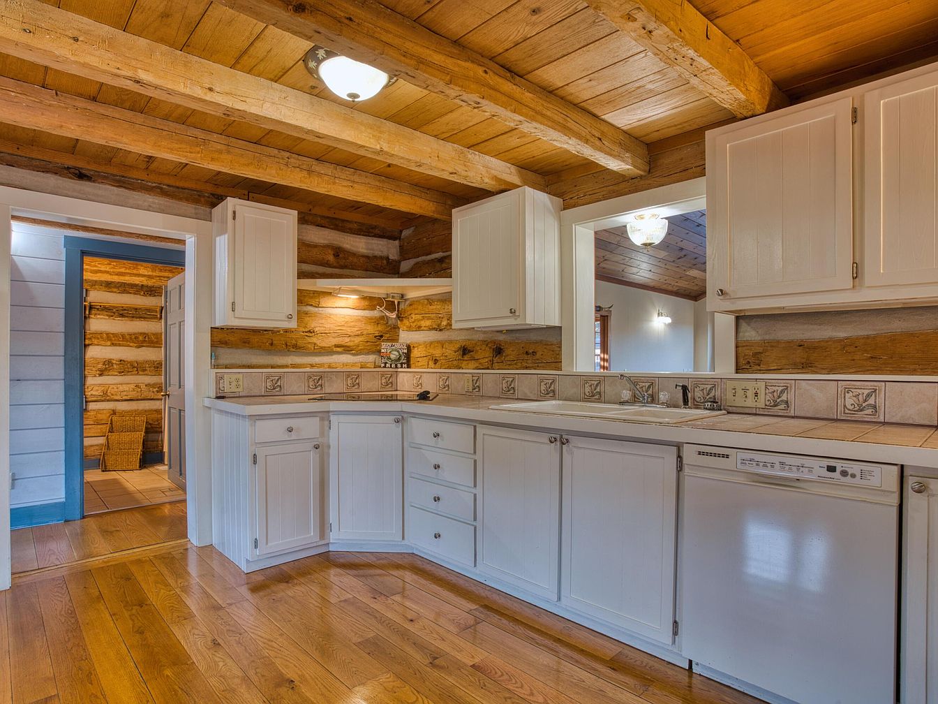 A rustic-style kitchen with natural wood plank flooring and exposed log walls creates a warm, inviting atmosphere. The ceiling features sturdy wooden beams and planks, complementing the rustic charm. White cabinets with simple silver knobs contrast beautifully against the logs, while the L-shaped countertop is tiled with decorative floral accents on the backsplash. The space integrates a dishwasher and a double sink, and a small open shelf is built into the wall. Soft, warm lighting brightens the workspace. A doorway leads to a mudroom with similar rustic walls, while a passthrough opens to an adjoining room, enhancing flow and airiness.