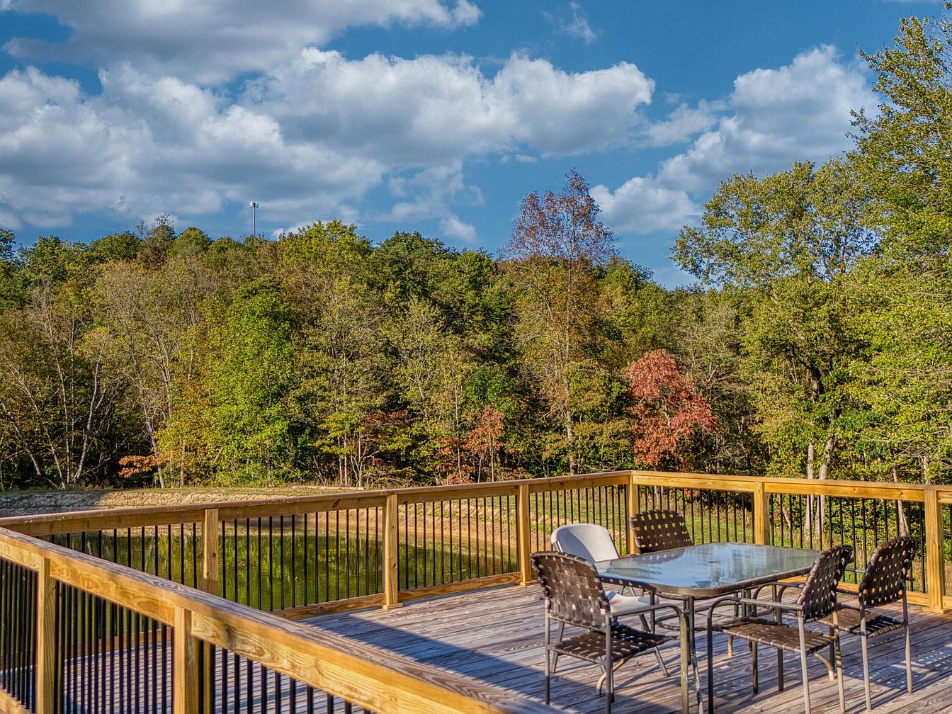 A spacious wooden deck overlooks a lush forest and small pond, surrounded by trees with green and hints of autumnal red and orange leaves. The deck features a contemporary black metal railing with sturdy wooden framing. In the center sits a glass-topped rectangular table with four woven dark brown chairs and a single white-cushioned chair, creating an inviting space for outdoor dining or relaxation. Sunlight bathes the deck, enhancing the natural wood grain and emphasizing the open, airy feel. The backdrop of blue sky dotted with fluffy clouds completes a tranquil, scenic outdoor retreat emphasizing serenity and nature.
