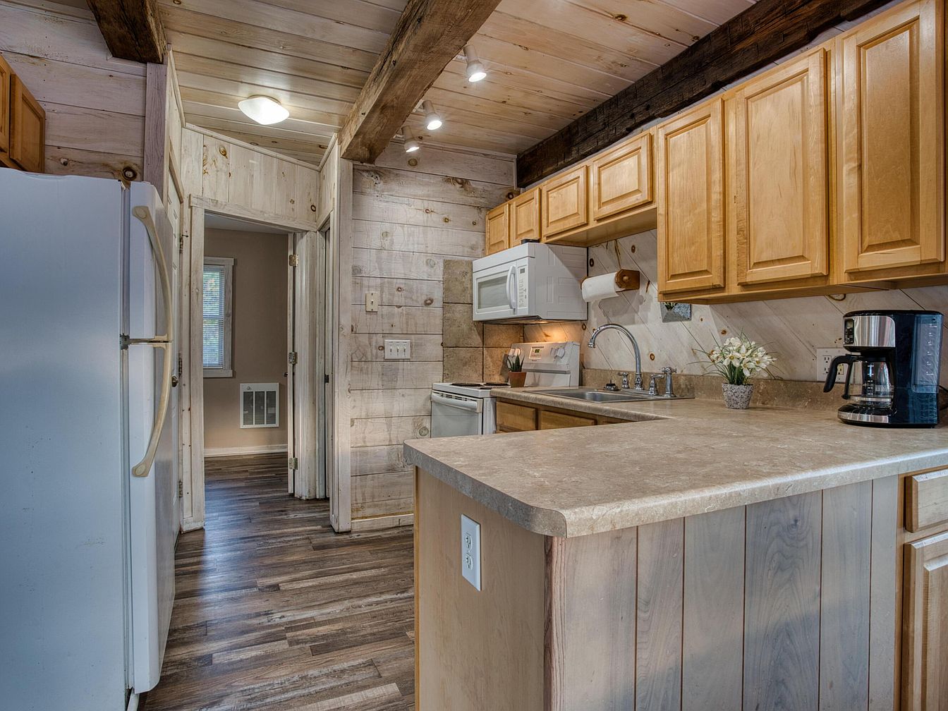 A cozy kitchen featuring a rustic aesthetic with natural wood panels on the ceiling and walls. Light honey-toned cabinets and matching woodwork create warmth, accented by exposed dark wooden beams above. The spacious L-shaped countertop is crafted from speckled stone or laminate, holding a black drip coffee maker and a small potted plant for a touch of greenery. There is a white refrigerator on the left, while a white microwave and stove line the back wall. The flooring is wide plank laminate in mixed wood tones, blending modern and country charm. Recessed lighting and a soft ceiling lamp brighten the inviting space.