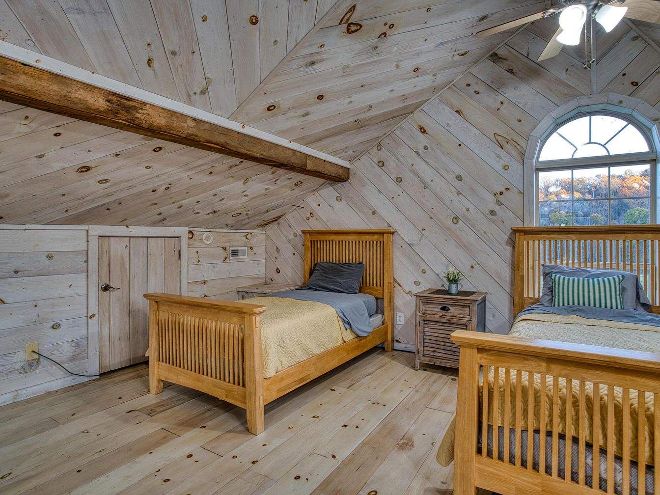 A cozy attic bedroom features two wooden twin beds with slatted headboards and footboards, placed against diagonally paneled pine walls and flooring, all finished in a lightly whitewashed stain that highlights the natural wood knots. A rustic exposed wood beam runs across the sloped ceiling. Between the beds is a small wooden nightstand with a drawer and a potted plant on top. A large arched window at the far end lets in natural light, casting a gentle glow over the space, and a ceiling fan with bright white blades adds a functional, airy touch to the warm, rustic aesthetic.