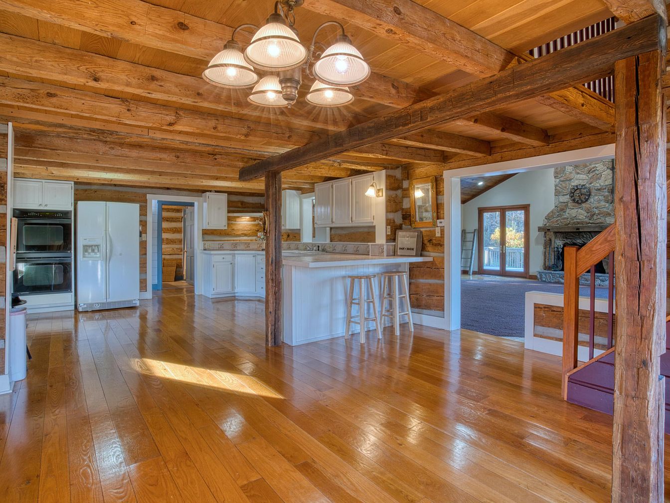 Warm wooden beams span the ceiling, highlighting the rustic log construction and lending a cozy, historic ambiance. The spacious kitchen features white cabinetry, a white double-oven, and refrigerator that contrast nicely with the honey-toned wood floors and walls. A long breakfast counter with white beadboard and three wooden stools provides casual seating. Large pendant lights with frosted glass shades hang above, casting a soft glow. There is an open view to a living area featuring a grand stone hearth and fireplace, located beneath vaulted ceilings and with glass doors opening to a sunlit outdoor area. The overall aesthetic merges farmhouse tradition with comfortable modern touches.
