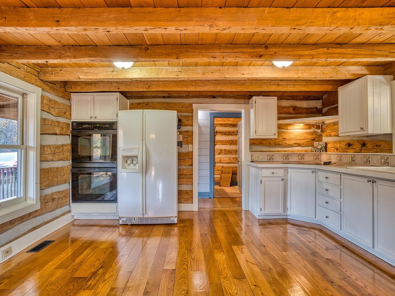 Warm wood tones dominate this kitchen, with natural log walls and exposed overhead ceiling beams giving a rustic and historic appeal. The floor is finished in polished light-brown hardwood planks that shine in the ambient light. White cabinetry lines the corner, contrasting with the wood, and features classic panel doors with simple metal knobs. A large white double-door refrigerator stands beside a sleek black double oven, blending modern appliances into the cozy setting. Square tile backsplash, subtly decorated with floral motifs, adds character beneath the cabinetry. A wide window provides abundant daylight and views of the outdoors, enhancing the inviting atmosphere.