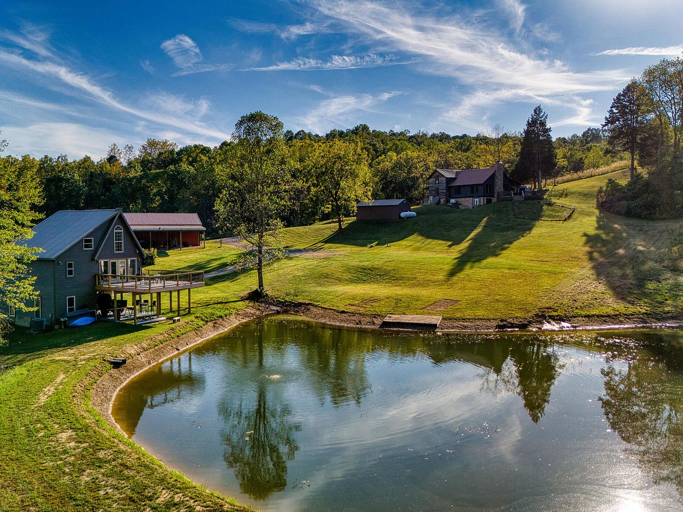 A broad, sunlit yard stretches between two country-style homes, separated by a hedge of trees and gently rolling hills. One home, with a gray exterior and metal roof, features an elevated wooden deck overlooking a tranquil pond with a curved shoreline, reflecting nearby trees and blue sky. The second house, set atop a gentle rise, has a rustic appeal with exposed timber and a front porch. Manicured green lawns link the houses, interspersed with mature shade trees, garden beds, and a gravel driveway leading to a distant red barn. The entire property is framed by natural woodland, imparting peace and seclusion.