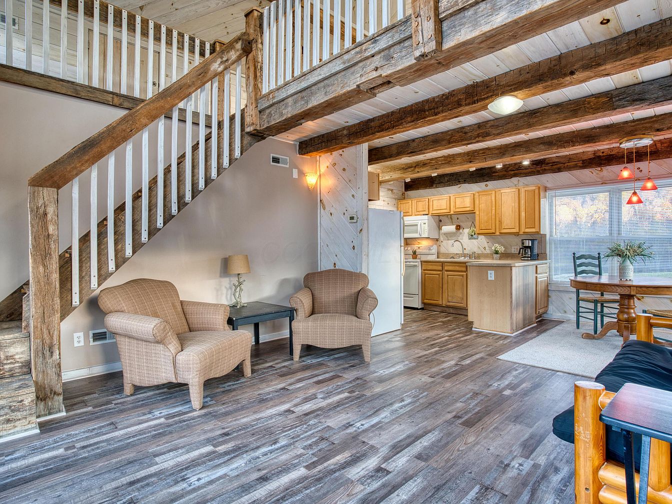 Spacious open-concept area with rustic wooden beams on the ceiling and a staircase featuring thick, exposed wood and white railings. The living area includes two cushioned armchairs in a soft tan check pattern with a small side table and lamp between them. The kitchen, tucked beneath the loft, features honey-colored cabinets, white appliances, and a compact breakfast island. Warm wood tones dominate, complemented by wide plank floors with a weathered gray finish. Red pendant lights hang above a round dining table beside large windows, flooding the room with natural light and offering views of the outdoors.