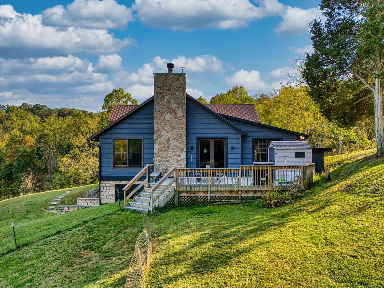 A charming historic American house sits nestled on a gentle green slope surrounded by lush trees and open sky. The house features dark blue wooden siding complemented by a tall, rustic stone chimney at its center. A wide wooden deck extends from the rear, bordered by a simple wooden railing and accessible via a short flight of stairs. The roof is a warm reddish-brown metal, adding to the home’s farmhouse charm. Large windows invite natural light inside, while the sprawling backyard and distant woodlands create a peaceful, scenic backdrop, perfect for enjoying tranquil country living.
