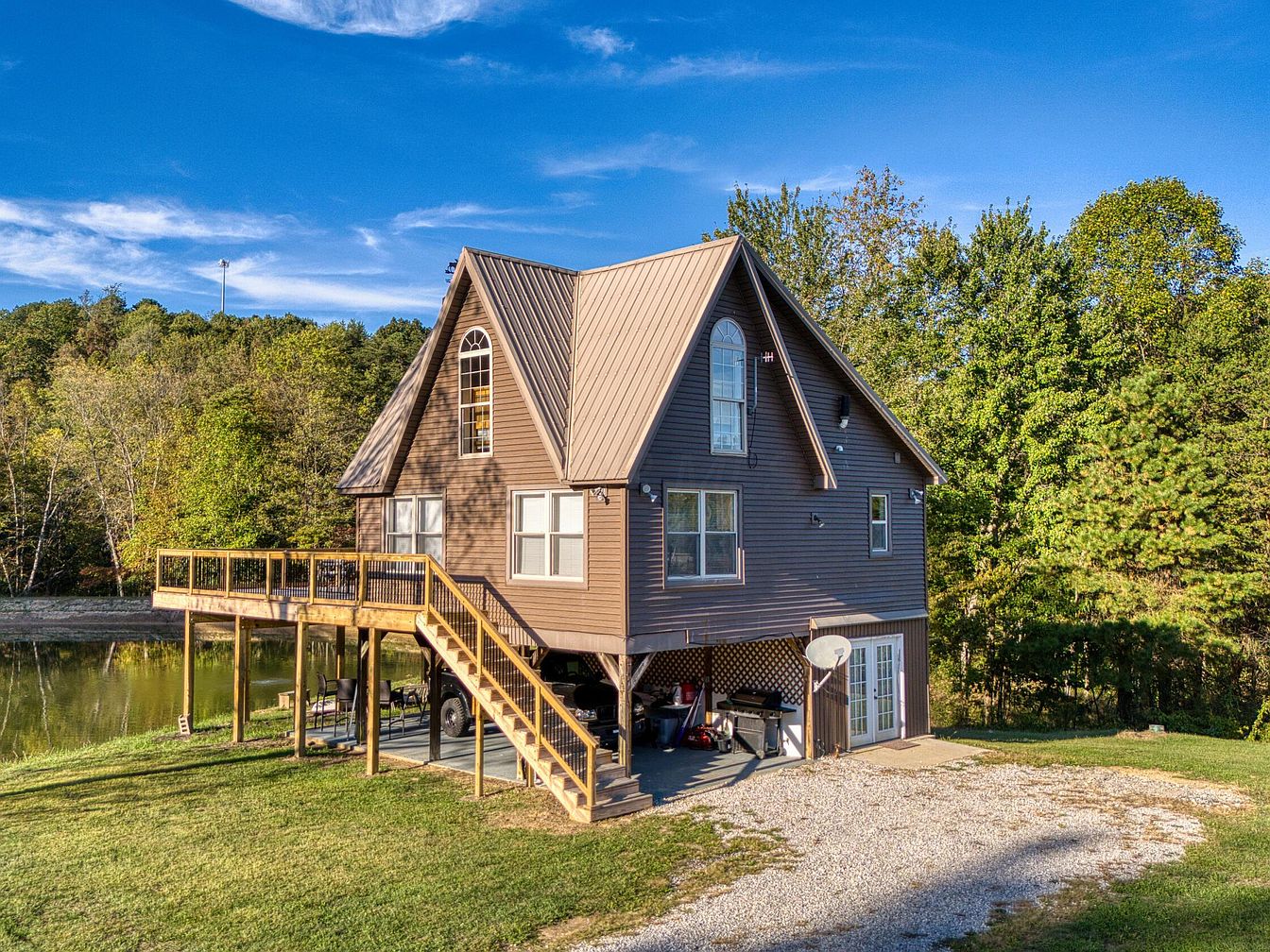 A two-story A-frame home stands amidst lush green surroundings, highlighted by a rich brown siding and a steep metal roof with matching color. The most prominent architectural feature is a tall, arched window on the upper floor, adding an elegant touch to the angular lines. A spacious wooden deck runs along one side of the house, accessed by a staircase with black metal railings, and overlooks a tranquil pond. Underneath the deck, a carport offers both storage and shelter. The gravel driveway, manicured lawn, and dense woods in the background create a peaceful, rustic setting for the property.