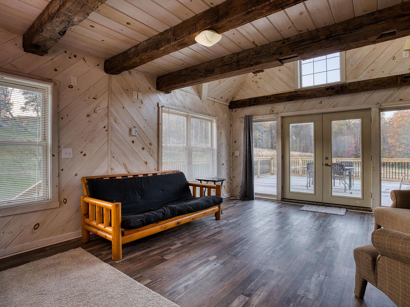 A spacious living room with rustic charm features exposed dark wooden ceiling beams contrasting against whitewashed knotty pine walls set in a diagonal pattern. Large windows and double glass doors let in abundant daylight, offering expansive views of the wooded outdoors and connecting to a wooden deck with patio furniture. The floor is a dark hardwood, partly covered by a beige area rug. A light natural wood futon with a simple black cushion sits along one wall, and a cozy neutral armchair rests in the corner, creating a blend of comfort, minimalism, and rustic aesthetics.