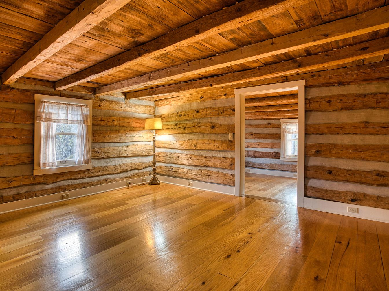 A charming space featuring exposed log walls with chinking in between, creating a rustic yet inviting feel. The wooden ceiling is supported by thick log beams running horizontally, enhancing the traditional architecture. Two windows with white trim allow natural light in, each adorned with sheer, cream-colored café curtains that soften the look. Honey-toned hardwood floors cover the room, complementing the golden hues of the logs and creating a seamless, nature-inspired palette. The area is unfurnished, highlighting the craftsmanship and warm textures throughout, making the space feel both open and cozy, perfect for a sitting area or cozy retreat.