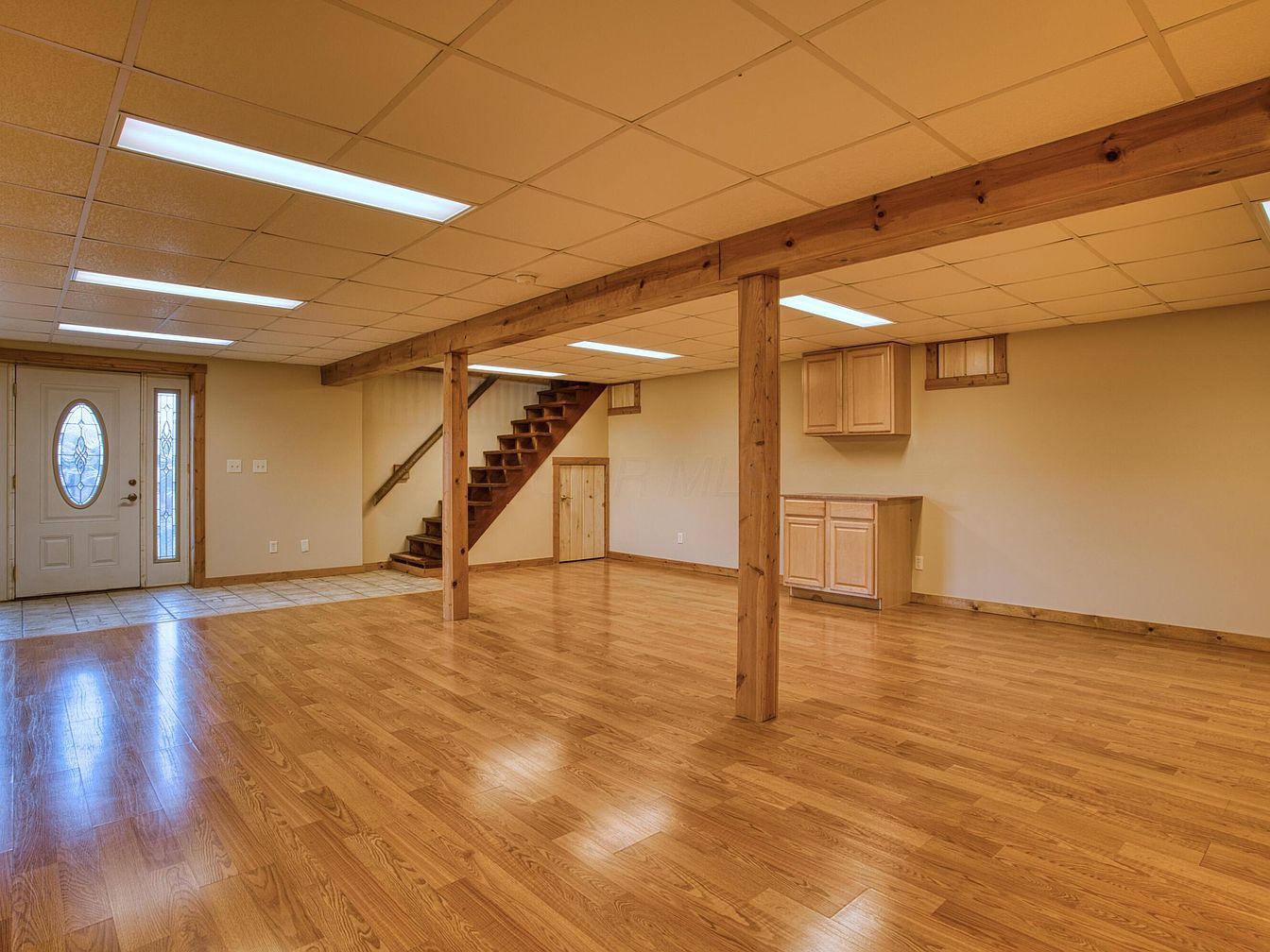 A spacious basement area with a warm, inviting atmosphere, highlighted by honey-toned hardwood floors and soft beige walls. The space feels open due to the absence of dividing walls, and two wooden support columns run from ceiling to floor, complementing the exposed wood trim around the doors and staircase. Recessed fluorescent lighting in a drop ceiling provides even illumination. To the left, a white exterior door with an oval glass insert allows light to stream in, and leads onto a small tiled section. Wooden stairs ascend to the upper floor, while simple wooden cabinets sit against the far wall for additional storage.