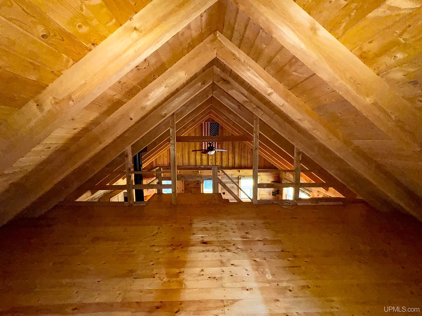 Spacious loft area featuring warm, natural wood paneling on the floors, walls, and vaulted ceiling, creating a cozy and inviting atmosphere perfect for family use. The open layout is enhanced by visible wooden beams and railings, providing safety without obstructing the view to the living space below. Natural light streams in from multiple windows, brightening the space. The open yet secure design makes it a suitable play area, reading nook, or an extra sleeping space for children. The wood’s honey-hued finish gives the space a rustic charm, blending traditional architecture with family-friendly versatility and comfort.