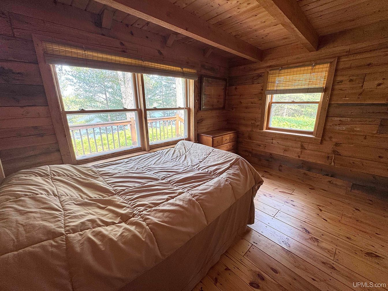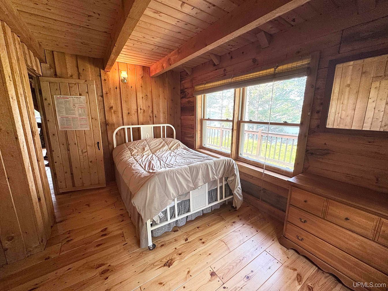 Warm wood paneling covers the walls, ceiling, and floor of this cozy bedroom, creating a rustic and inviting atmosphere ideal for a family-focused home. Natural light floods through two large windows, one opening out to a scenic deck with wooded views, perfect for families who enjoy nature. A simple wooden bed is positioned to take advantage of the calming views, topped with a soft, neutral-colored comforter. Minimalist wooden blinds add warmth and privacy, while a compact dresser offers essential storage. Exposed beams overhead add architectural interest to this peaceful, retreat-like space designed with comfort and togetherness in mind.