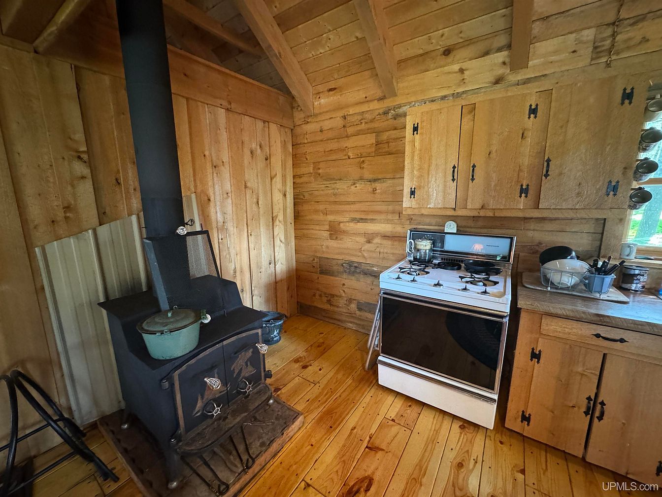 This cozy kitchen corner features a warm, rustic atmosphere with natural wood plank walls and matching wood cabinetry, highlighted by black metal hardware. The wooden ceiling, exposed beams, and polished plank floor add to the authentic, inviting cabin feel. A freestanding black wood-burning stove sits to the left with a classic kettle on top, perfect for heat and family meals. A white gas stove with a traditional oven offers practical cooking space. Ample upper and lower cabinets provide storage, while a countertop holds neatly arranged dishes and utensils. The window above the sink brings in natural light, creating a friendly, homey environment.