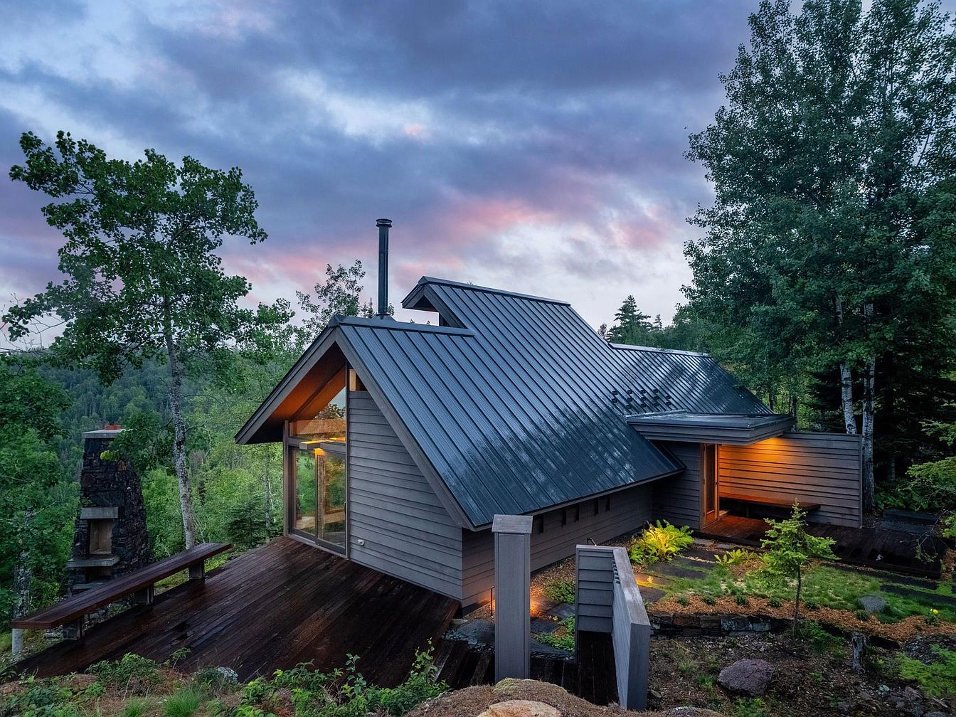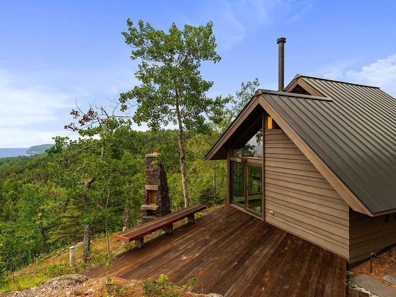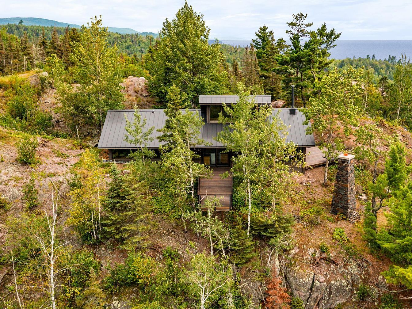 This architect-designed, 1,100-square-foot sanctuary in Silver Bay, MN, masterfully blends modern Scandinavian style with its dramatic natural setting between rock outcroppings overlooking Lake Superior and Palisade Head. Created by Kelly Davis of SALA Architects, the home boasts a long, narrow floorplan that maximizes breathtaking views through glass walls and a striking 16-foot clerestory window. Built for efficiency and family comfort, it features two bedrooms, polished concrete floors with radiant heat, Douglas fir built-ins, and a Danish wood stove. The 32-foot “bird walk” cantilevered deck and outdoor shower emphasize a seamless connection to the landscape. With sustainable features like a metal roof and passive solar design, this $900,000 retreat is a perfect, modern family getaway.
