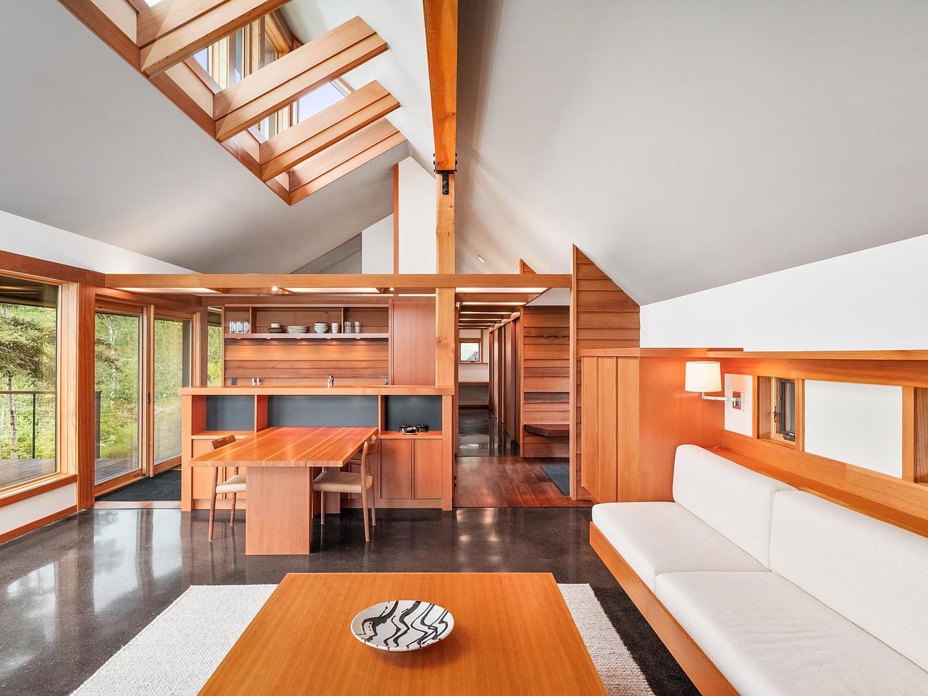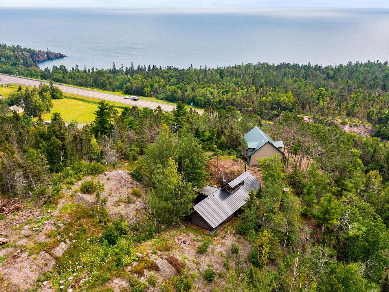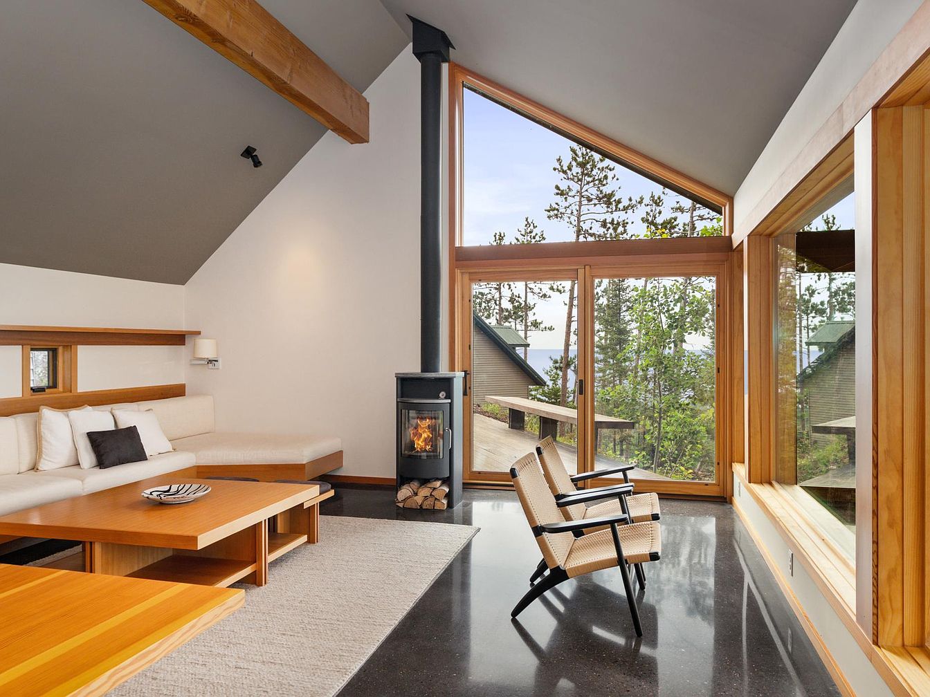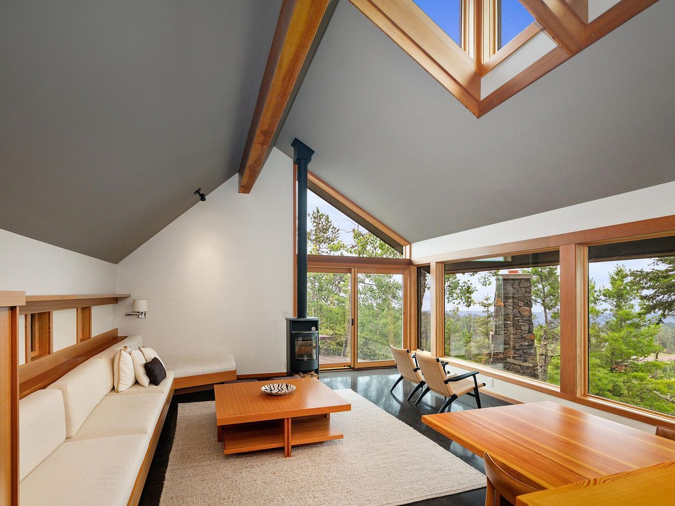 This architect-designed, 1,100-square-foot sanctuary in Silver Bay, MN, masterfully blends modern Scandinavian style with its dramatic natural setting between rock outcroppings overlooking Lake Superior and Palisade Head. Created by Kelly Davis of SALA Architects, the home boasts a long, narrow floorplan that maximizes breathtaking views through glass walls and a striking 16-foot clerestory window. Built for efficiency and family comfort, it features two bedrooms, polished concrete floors with radiant heat, Douglas fir built-ins, and a Danish wood stove. The 32-foot “bird walk” cantilevered deck and outdoor shower emphasize a seamless connection to the landscape. With sustainable features like a metal roof and passive solar design, this $900,000 retreat is a perfect, modern family getaway.