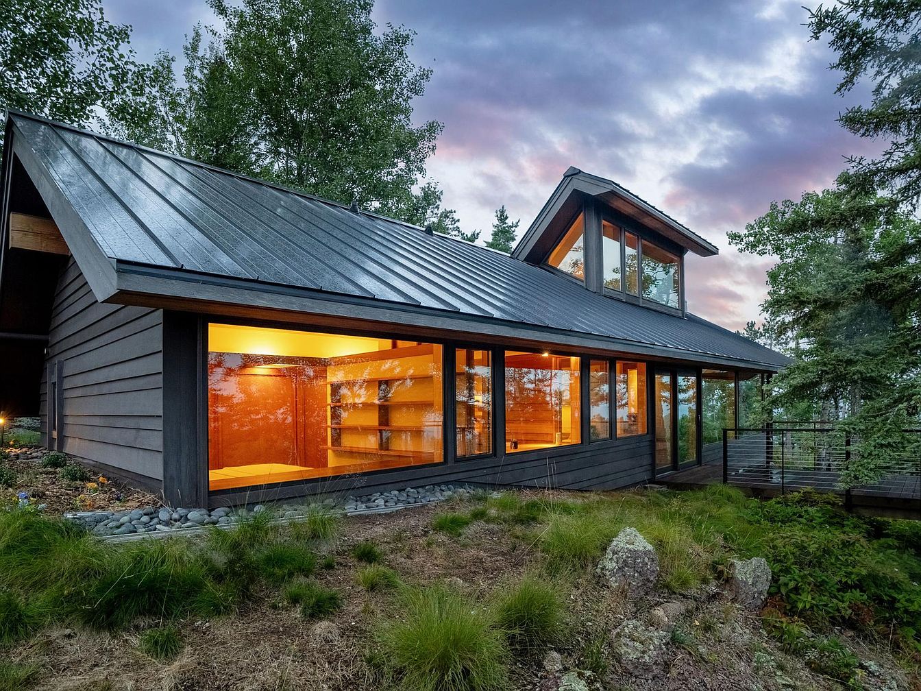 A modern mountain home with a striking sloped roof sits nestled among tall pine trees and lush greenery. The house is designed with large floor-to-ceiling windows, allowing ample natural light to flood the spacious interiors and offering panoramic views of the surrounding forest. Warm interior lighting creates a cozy, inviting glow visible from outside, showcasing built-in wooden shelving and open, airy living spaces ideal for family gatherings. The exterior features gray horizontal siding and a sleek metal roof, while natural stone accents and a gently sloping landscaped yard provide a seamless connection between the home and its picturesque outdoor setting.