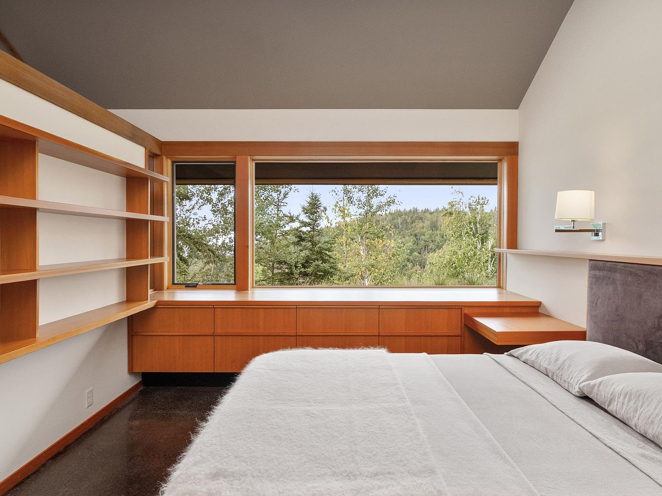 A serene bedroom features a large picture window with expansive views of lush greenery, creating a tranquil and airy feel ideal for families. Sleek wooden built-in shelves and cabinetry line one wall, offering ample storage space for books, toys, or keepsakes, making the room organized and kid-friendly. The bed is positioned to maximize natural light and views, dressed in soft white bedding for a cozy, inviting atmosphere. A mounted wall lamp provides gentle ambient lighting, while the neutral wall colors and simple, modern furniture evoke a peaceful, spacious environment perfect for rest or shared family moments.