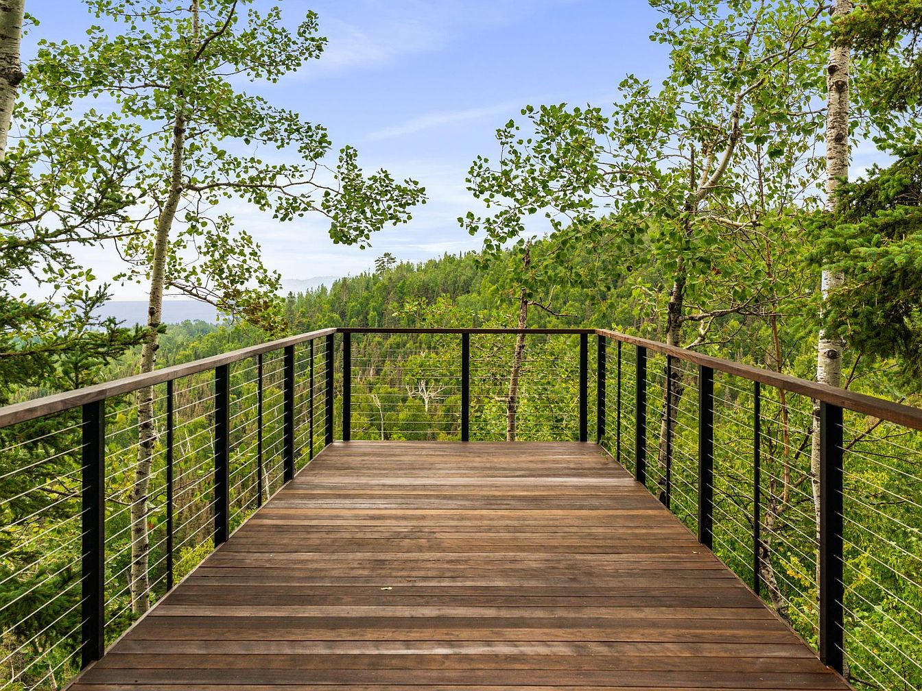 A spacious wooden deck extends outward into a lush green forest, framed by sleek black railings with horizontal cable wiring for safety and modern appeal. The warm-toned wood planks create a welcoming and durable surface, ideal for gatherings or relaxing moments with family. Tall aspen and pine trees surround the deck, providing a natural sense of privacy and a stunning panoramic view of the forested hills beyond. The open-air design offers excellent visibility and fresh air, making it a perfect play area for kids and a peaceful retreat for adults. The tranquil setting enhances the home’s harmonious connection with nature.