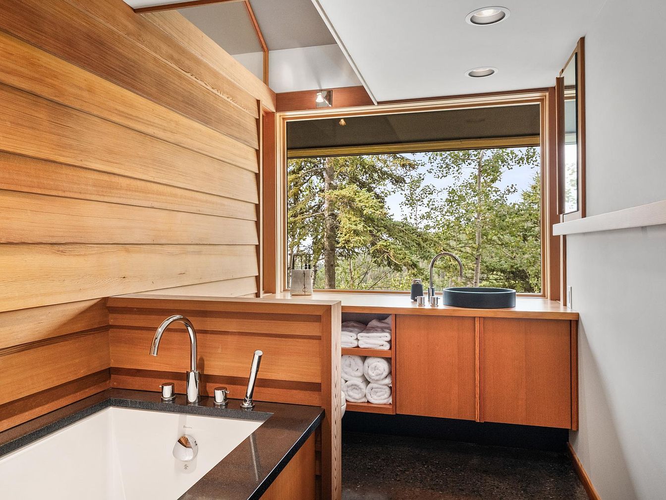 This serene bathroom features modern wooden paneling with warm, honey-colored horizontal slats that create a natural, inviting atmosphere. The deep soaking tub is framed by sleek black countertops and chrome fixtures, providing comfort for families while keeping cleaning simple. A spacious wooden vanity stands by a large window, offering beautiful views of lush greenery outside, making bath time relaxing and scenic. Open shelves beneath the sink area are neatly stocked with rolled white towels, adding convenience and a spa-like touch. The overall color scheme blends wood tones with crisp whites and blacks, balancing warmth and modern sophistication.