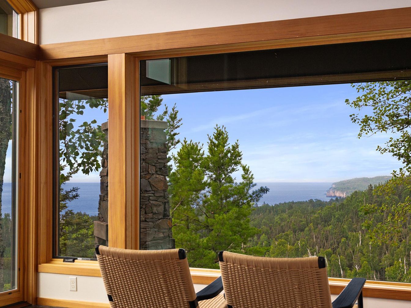 A cozy seating area features two woven rattan chairs with dark wooden arms positioned to face a breathtaking view. Floor-to-ceiling windows framed with warm, honey-toned wood open up the room to lush green forests and distant blue waters, creating a tranquil and inviting atmosphere perfect for family relaxation or quiet reading time. The ample natural light makes this an appealing gathering spot for all ages, fostering a serene ambiance with unobstructed nature views. The design’s minimalist profile, natural materials, and clean architectural lines offer a harmonious connection between indoor comfort and scenic outdoor beauty.