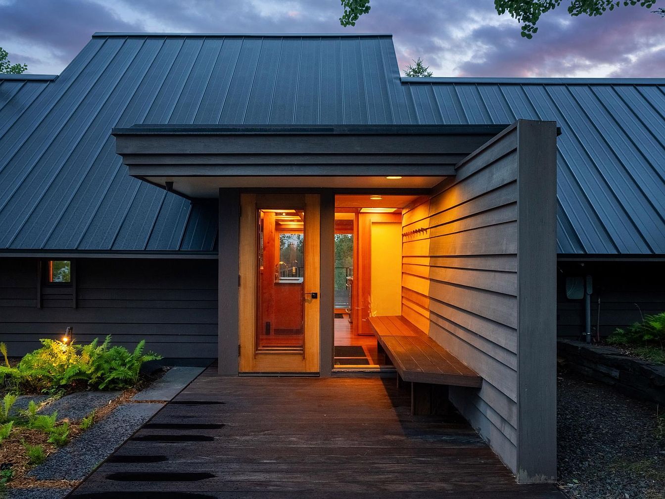 A modern and inviting front entryway welcomes families with a blend of practicality and style. The walkway is set with natural stone pavers bordered by vibrant green ferns, leading to a sheltered wooden porch. The entry is framed by horizontal wood paneling in a deep, slate-grey hue, complemented by the clean angular lines of a metal roof overhead. A built-in wooden bench along one wall provides a comfortable spot for removing shoes or setting down bags, making it family-friendly and functional. Warm interior lighting glows from the doorway, creating a sense of warmth and hospitality against the evening sky.