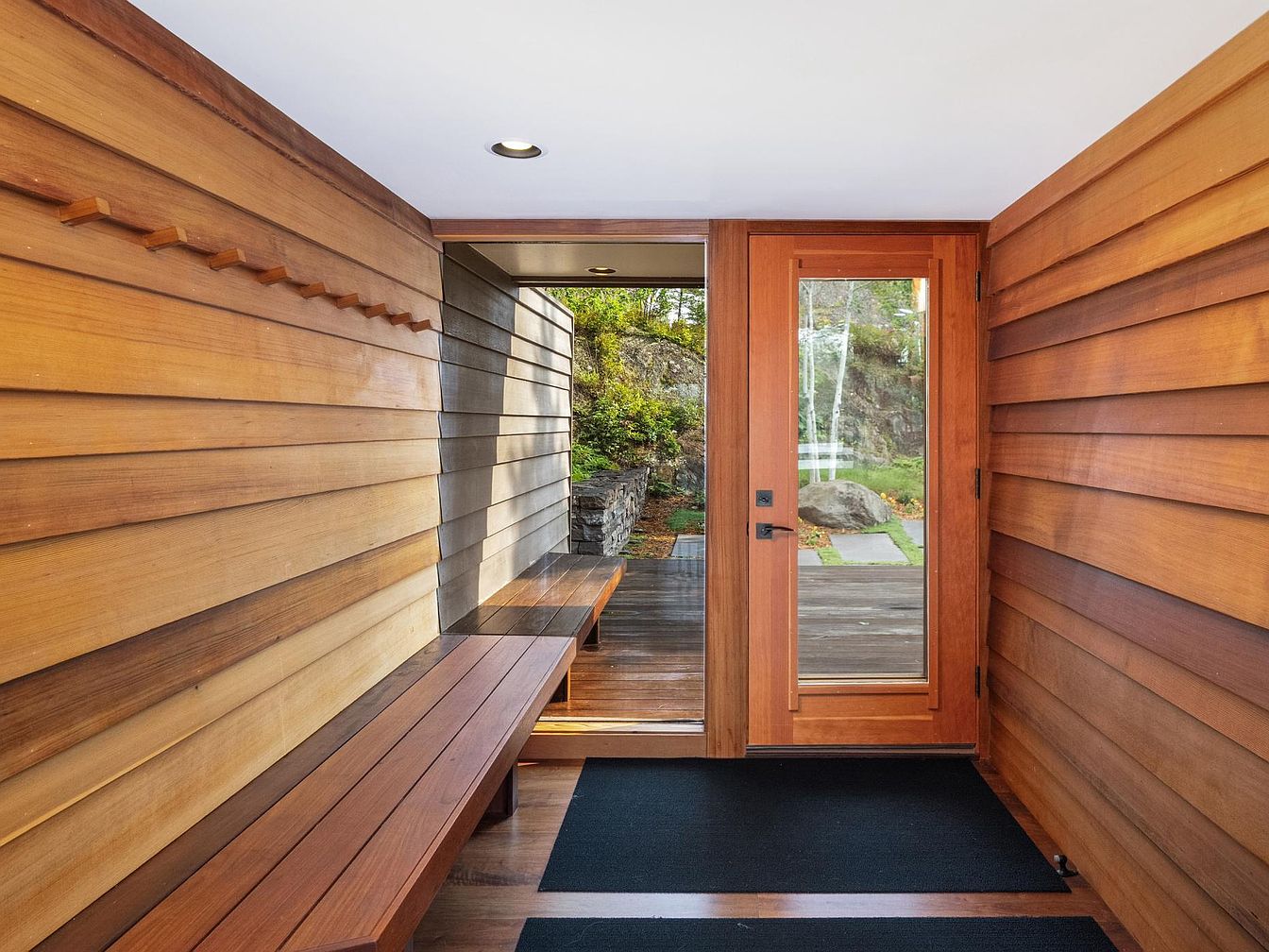 A welcoming entryway is shown with warm, horizontal wooden paneling creating a cozy and natural ambiance. A sturdy built-in wooden bench runs along one wall, offering a perfect space for families to sit and remove shoes or store bags, ideal for everyday convenience. Above the bench, a row of modern, squared-off wooden hooks adds both style and functionality for hanging coats and backpacks. The glass-paneled front door allows plenty of natural light, brightening the space and blending indoors with the greenery outdoors. The flooring features practical dark doormats, which help keep the home clean and withstand heavy foot traffic.