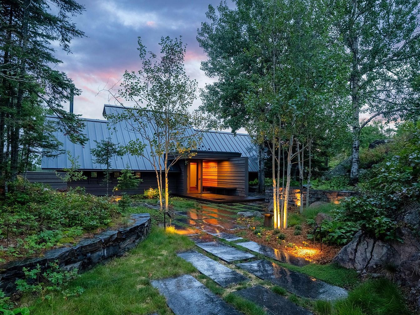 A modern front entrance is highlighted with warm, welcoming lights, guiding the way along a stone pathway bordered by lush greenery and mature trees. The house’s exterior features sleek horizontal lines and a dark, neutral palette that blends seamlessly with the surrounding landscape, creating a peaceful and private setting ideal for families. The gently sloped metal roof adds architectural interest while complementing the natural environment. The wide entryway is designed for easy access, and the front yard offers plenty of open green space for children to play safely. Natural stone retaining walls provide both beauty and functionality, enhancing the outdoor living experience.