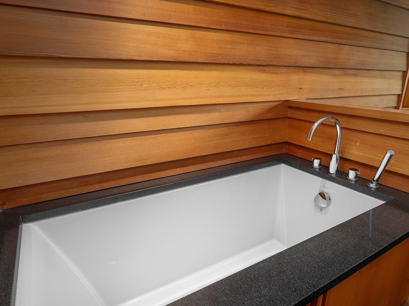 A modern, rectangular soaking tub is set against a backdrop of horizontal, honey-toned wood paneling, creating a warm and inviting atmosphere. The tub is surrounded by sleek, black quartz countertops that add elegance and contrast to the light wooden walls. A polished chrome faucet and matching handles lend a contemporary touch, while the built-in hand shower offers convenience for families with young children. The tub’s large, deep basin makes it ideal for family-friendly baths or relaxing soaks. The natural tones and clean lines highlight a tranquil setting, perfect for family relaxation and daily routines.