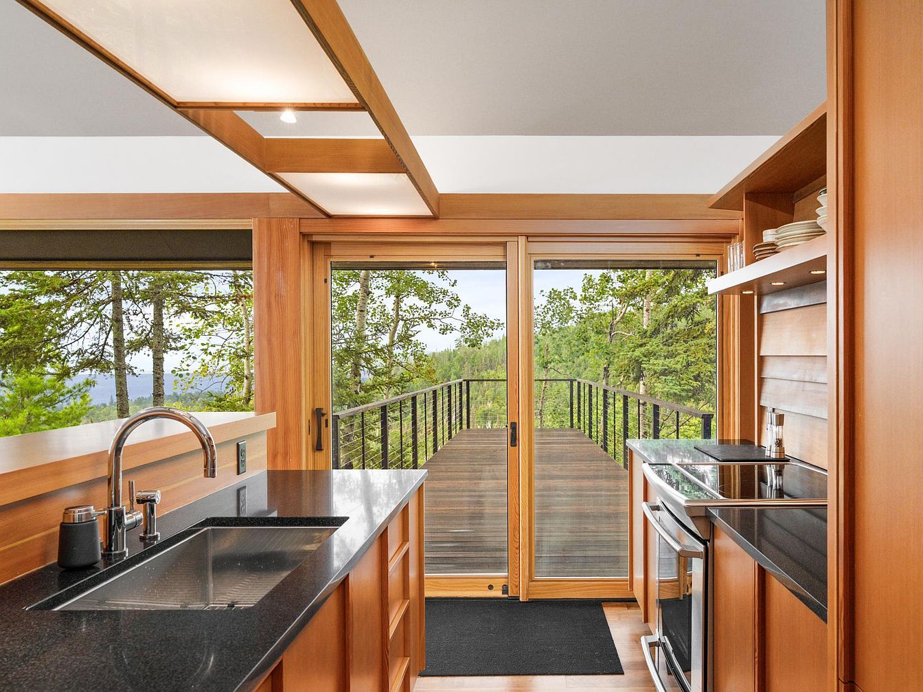 A modern kitchen opens directly onto a spacious wooden deck overlooking lush green trees, perfect for family gatherings and enjoying nature. Warm wood cabinetry and trim give the space a cozy, inviting feel, while sleek black countertops provide a contemporary touch. The kitchen features an under-mount sink with a polished chrome faucet, electric stove, and open shelving neatly arranged with plates. Large sliding glass doors fill the room with natural light, enhancing the bright and airy atmosphere. The seamless connection between kitchen and outdoor deck makes for easy entertaining or supervising children playing outside, blending indoor comfort with the beauty of the outdoors.
