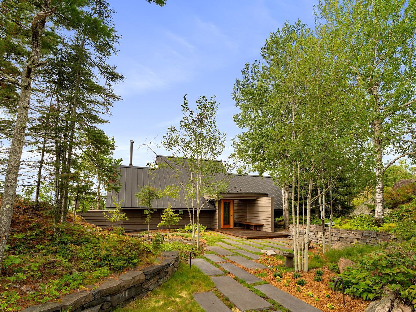A welcoming stone pathway leads to the front door of this contemporary American home, nestled among tall, mature trees and surrounded by lush greenery. The design emphasizes a strong connection to nature, featuring earth-toned exterior siding and a sleek metal roof that blends seamlessly with the environment. Low stone walls border the path, creating gentle divisions in the garden while adding a sense of structure. The spacious front deck and easy-to-navigate landscaping make it ideal for family gatherings or outdoor play, while the greenery provides both beauty and privacy in a peaceful, inviting setting.