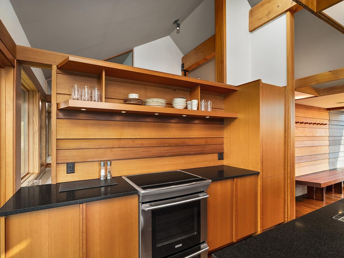 Modern kitchen featuring warm wood cabinetry, horizontal wooden wall paneling, and sleek black countertops that provide ample workspace for meal preparation. An electric range sits centrally beneath open wooden shelves displaying plates, bowls, and glassware, making it easy for families to access essentials during busy mornings. Large windows bring in natural light, brightening the space and offering pleasant outdoor views. Clean lines and uncluttered surfaces create an inviting, functional area perfect for family cooking and gatherings. The open shelving and bench seating nearby allow for easy organization and a welcoming atmosphere ideal for both everyday life and entertaining guests.