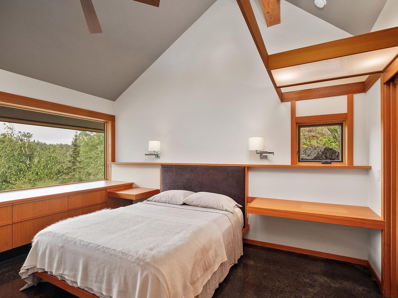 This bedroom features a cozy and modern layout with a large window offering a view of lush greenery, allowing plenty of natural light to flood the space. The walls are painted white, complemented by natural wood trim and built-in shelving that adds warmth and character. The queen-sized bed sits against a dark accent panel, flanked by two sleek wall-mounted lamps, perfect for nighttime reading. Generous built-in desks on both sides provide ample workspace for family needs, study, or hobbies. The high, angular ceiling with exposed wood beams enhances spaciousness, creating a bright, inviting, and family-friendly environment.