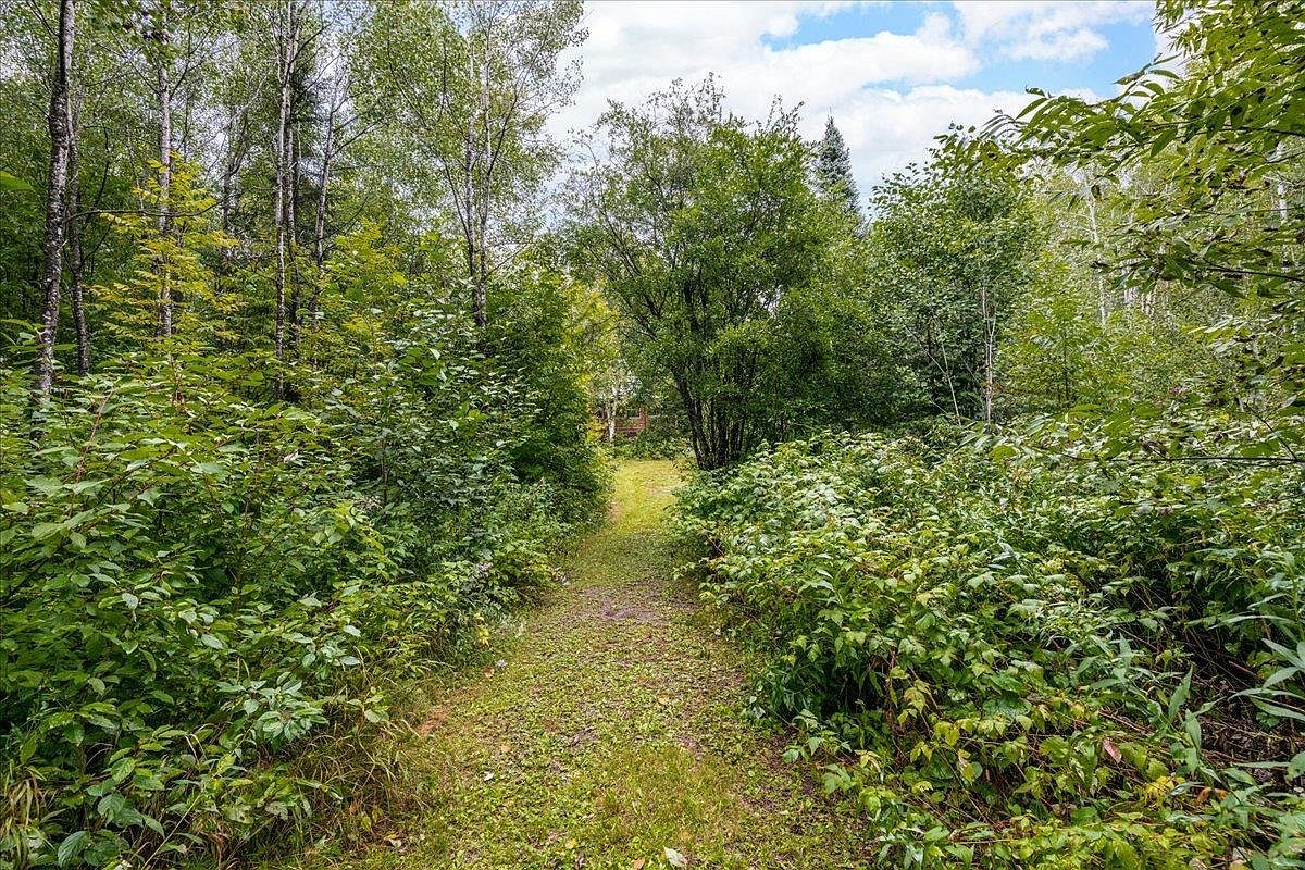 A lush, grassy path winds through dense greenery, framed by tall birch and leafy deciduous trees. The trail is enveloped by vibrant green foliage, creating a private, woodland atmosphere ideal for outdoor family adventures, nature walks, or children’s play. The overhanging branches and thick shrubs enhance privacy and natural beauty, providing a serene, secure play space. The open sky above brings in plenty of daylight, making this backyard trail both inviting and safe. The abundant plant life and accessible trail offer an idyllic escape just steps from home, perfect for family bonding and exploration.