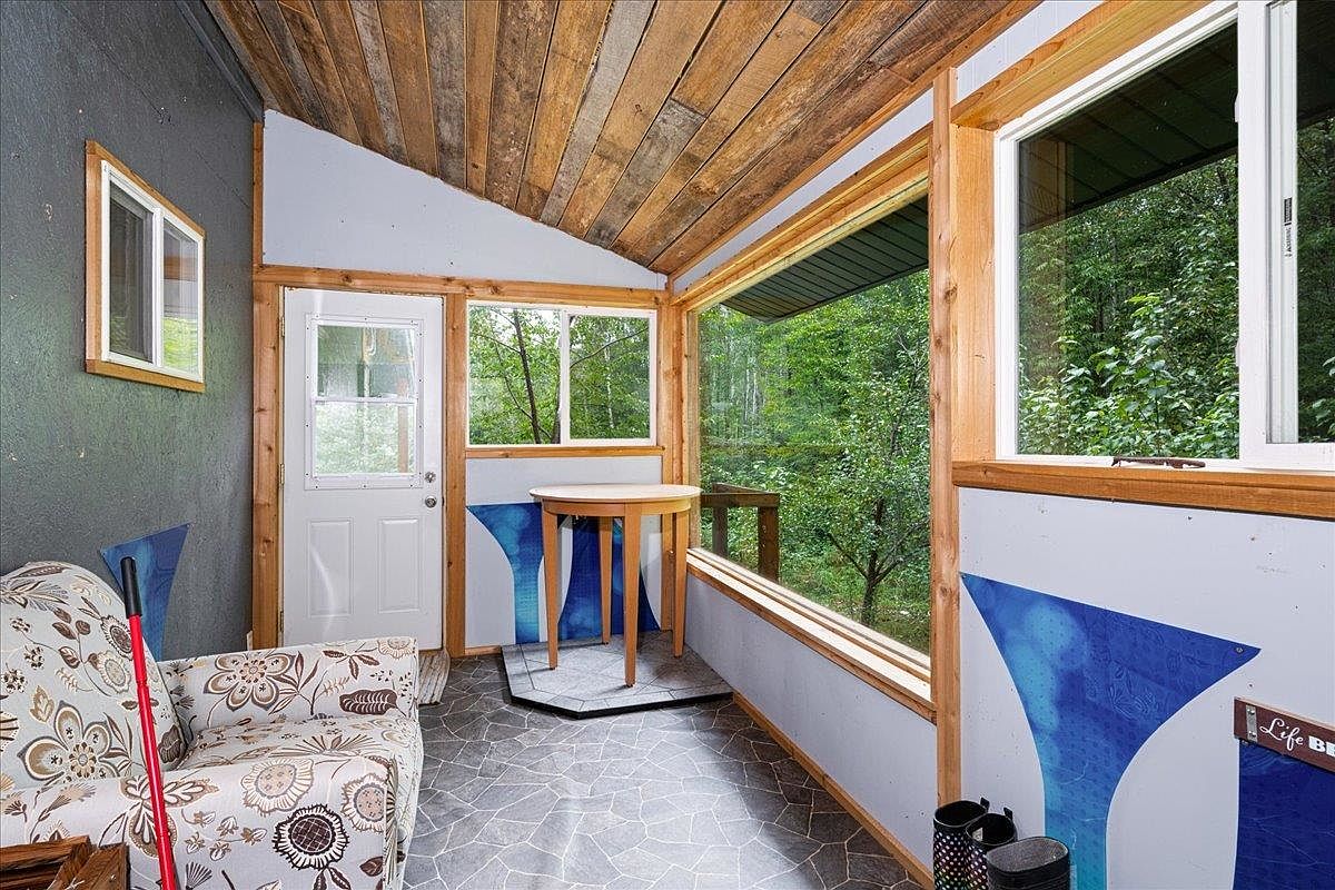 This bright sunroom offers a cozy and welcoming space ideal for family relaxation or casual gatherings. Large windows line one wall, providing ample natural light and picturesque views of surrounding greenery, bringing the outdoors in and making the space perfect for kids to enjoy nature safely. The rustic wood-paneled ceiling adds a warm cabin feel, while the geometric tile floor is both stylish and easy to clean—ideal for busy families. A floral-patterned armchair invites comfort, and a small wooden table sits near the window, perfect for games, crafts, or family snacks. Blue decorative wall accents enhance the playful, cheerful ambience.