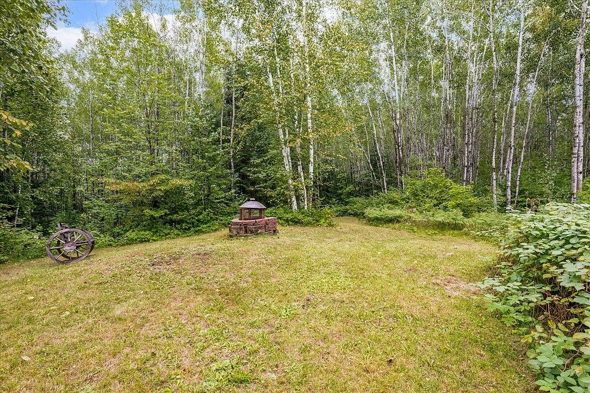A spacious backyard surrounded by tall birch and lush green trees, creating a serene and private natural setting. The grassy area offers ample room for children or pets to play safely, while the centerpiece is a circular brick firepit with a metal cover, ideal for family gatherings or roasting marshmallows. An old-fashioned wooden wagon wheel adds rustic charm and character to the landscape. The blend of greenery, open sky, and lightly rolling lawn provides a peaceful retreat where families can relax or entertain outdoors, making it a perfect spot for quality time and outdoor activities.