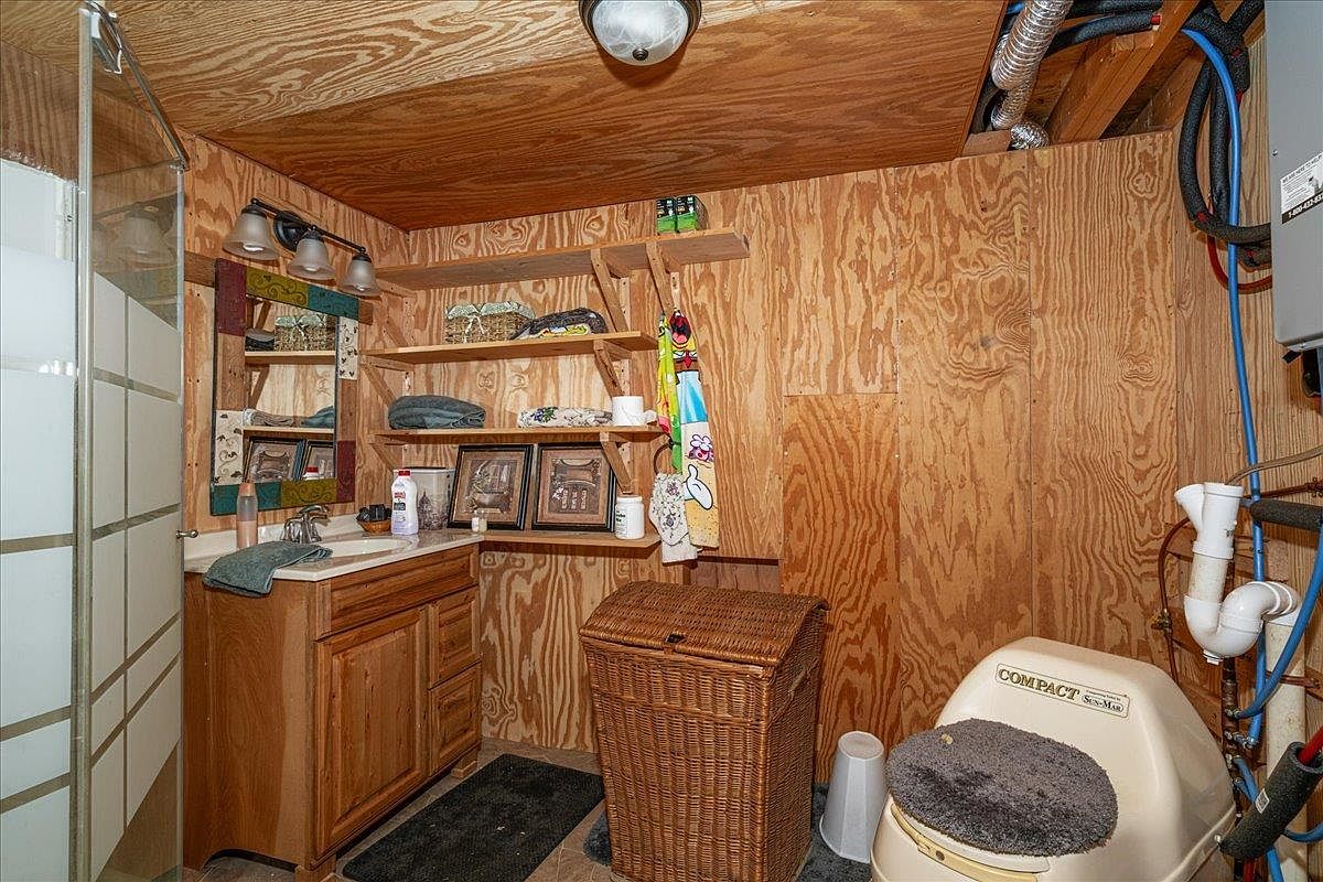 This cozy bathroom features natural wood paneling on the walls and ceiling, creating a rustic, cabin-like ambiance. A single sink vanity with wood cabinetry sits against one wall, topped with a mosaic-framed mirror and under a trio of traditional light fixtures. Open shelves above the counter provide convenient storage for towels, toiletries, and framed family photos, making it easy to stay organized. A wicker laundry basket offers both function and charm. The presence of a composting toilet and accessible shower area adds practicality, making this space ideal for families seeking comfort and eco-friendliness. The color palette is warm with earthy wooden tones throughout.