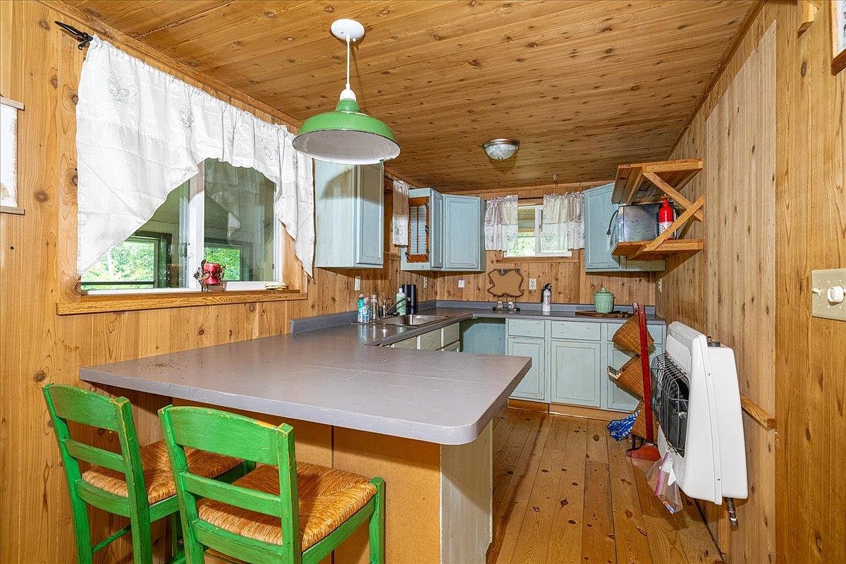 Warm and inviting kitchen featuring knotty pine walls and ceiling for a classic, rustic American charm. The spacious gray countertop provides ample workspace, with two bright green wooden chairs tucked underneath, creating a friendly spot for casual family meals or homework time. Light blue cabinets with simple white curtains above large windows infuse the space with natural light and a cheerful, airy feel. Open wooden shelves allow for accessible storage, while durable wood floors are both practical and perfect for busy family life. Thoughtful details and a pendant lamp overhead add character to this functional family-friendly kitchen.