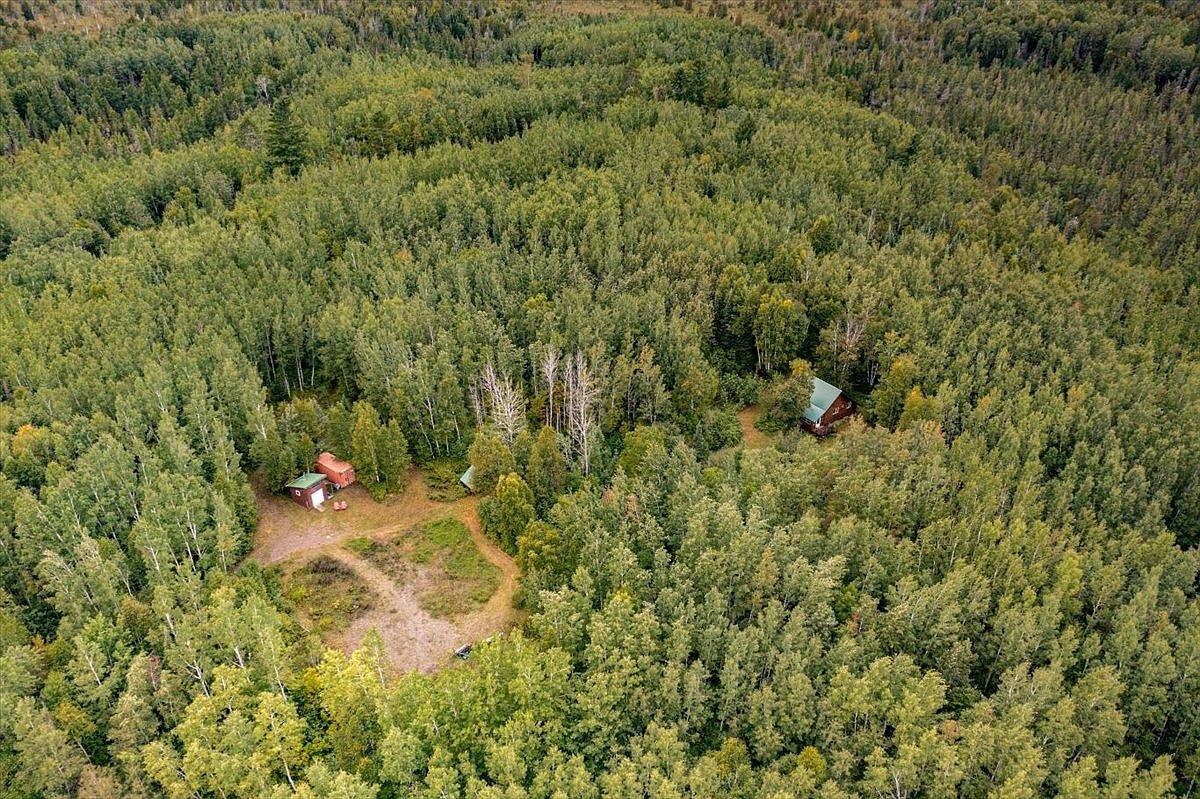 An aerial view reveals a home surrounded by dense, leafy woodlands, offering unmatched privacy and a serene natural environment. The property includes a main cabin with a green roof and a secondary structure, possibly for guests or storage, both set amidst open clearings ideal for play or gatherings. The expansive, tree-lined grounds provide ample space for children to explore and families to enjoy outdoor activities together. The lush green hues of the forest evoke tranquility, while wide, natural trails and patches of sunlit grass encourage safe, family-friendly adventures right at home. Architectural details blend wood and nature harmoniously.
