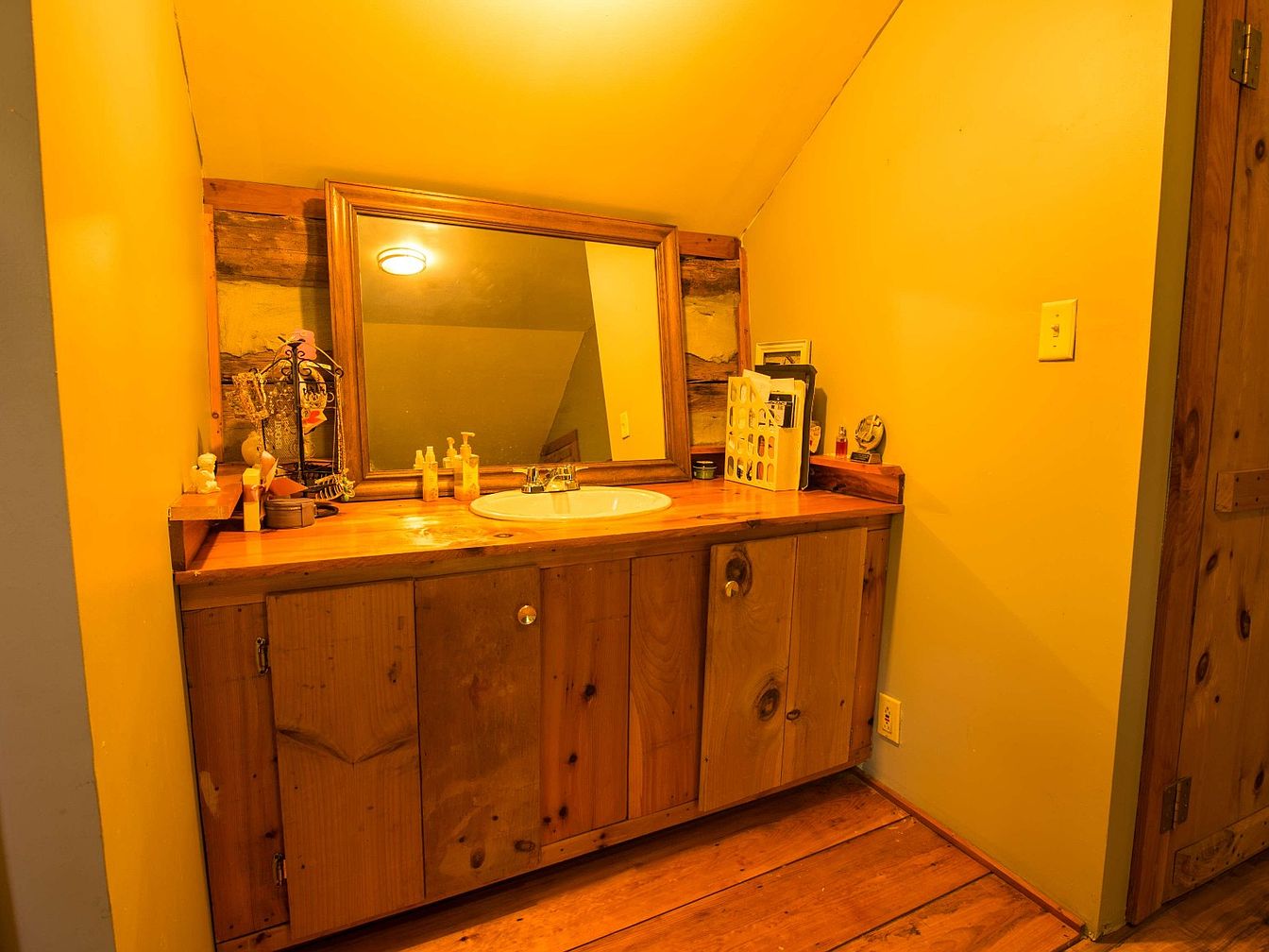 A cozy bathroom vanity corner features rustic wooden cabinetry with natural knots and warm tones, blending seamlessly into matching hardwood floors. Tucked beneath a gently sloped ceiling, the vanity is topped with a solid wood countertop fitted with a round white sink and modern chrome faucet. A large framed mirror rests above, reflecting soft, ambient lighting that fills the space with a golden glow. Everyday essentials, including soaps, toothbrush holders, and storage trays, are easily accessible, promoting organization that suits family living. The overall palette is golden yellow and honey-colored wood, offering a warm, welcoming environment with sturdy finishes and safe rounded edges.