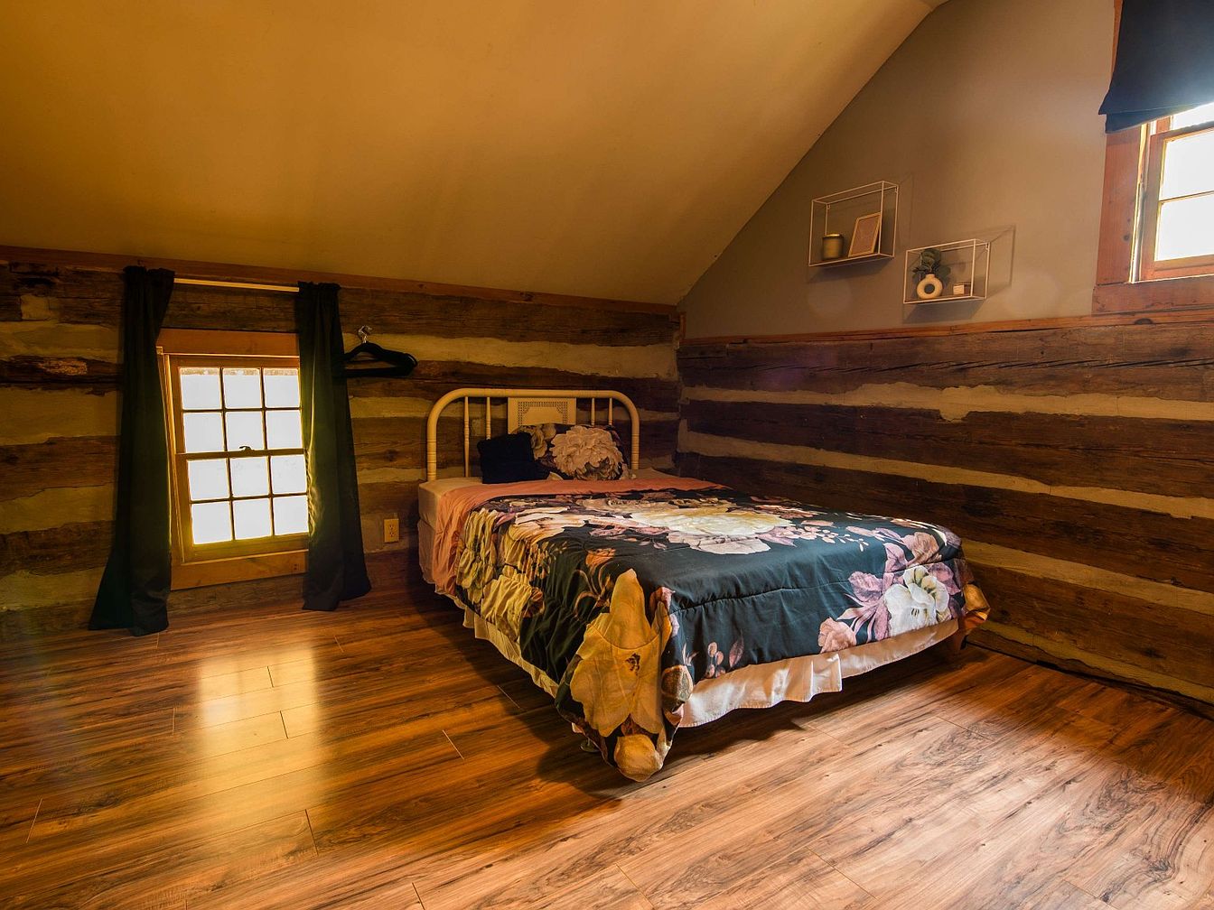 Cozy bedroom featuring a rustic yet inviting atmosphere, highlighted by exposed wooden log walls and warm-toned wooden flooring. A double bed with a decorative floral bedspread takes center stage, complemented by soft cushions that enhance comfort. There is plenty of floor space for children to move around safely, making it family-friendly. Natural light pours in from two windows, one beside the bed and another high on the angled wall, both framed in wood and dressed with simple, dark drapes. Minimalist wall shelves hold small decor items, adding charm without clutter. The room’s overall aesthetic is warm and welcoming, perfect for restful nights.